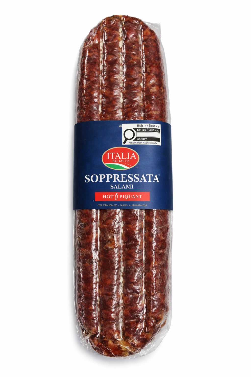 Italia Soppressata Salami is a rustic style salami, made from lean choice cuts of 100% pork. It's a salami of a medium grind, pressed carefully and seasoned with a distinct blend of premium spices. Naturally aged to produce a unique flavour and texture with no fillers, starter culture or MSG added. This salami comes in hot or mild flavours, large or small sizes.